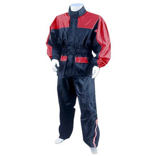 Jafrum , Motorcycle Rain Gear - Waterproof Rain Coats Two Piece RS5031 Red. Item: RS5031Red Color: Black/Red Brand: Jafrum Features: Two Piece Made of Quality Waterproof Fabrics Polyester Mesh Lining in Jacket Duratex Patched on Trouser Seam Sealed Two front pockets (velcro) on the jacket and one pocket (velcro) on the pants. Zippers on the legs with velcro to accommodate boots Sizing Info [img]